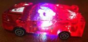 Машинка изготовлена из прочной, прозрачной пластмассы.При легком ударе,начинает мерцать огоньками.8,5 см * 3 см