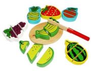 Подарите ребенку такой набор, и у него появится своя игрушечная кухня! В комплекте вы найдете несколько фигур с изображением фруктов и ягод, а также разделочную доску и игрушечный нож. Каждая фигура уже «разрезана», то есть она разделяется на три части и собирается снова с помощью специальных «липучек». Ребенок сможет помочь маме на кухне и поучаствовать в домашних делах, играя с набором. Все детали сделаны из качественной древесины, покрытой лаком и безопасными красками. Игра отлично развивает мелкую моторику и координацию движений, а также прививает правильные ролевые модели.