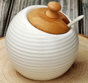 Небольшая керамическая банка подойдёт для хранения сладостей – мёда, сахара или леденцов. В комплекте бамбуковая крышка и керамическая ложечка.