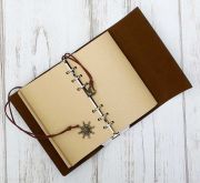 Тончайшая состаренная бумага, собранная на крепкую пружину, бархатистый разворот, обёртка из экокожи с тиснением, тонкий ремешок с подвеской - детали, делающие обычный блокнот изысканным подарком.