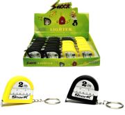 Шокер выполнен в виде рулетки-брелка, при попытке вытянуть измерительную ленту бьет током.