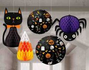 Весёлые друзья спешат на Хэллоуин. Эффектный комплек для украшения детского или семейного праздника. Декор-комплект состоит из двух китайских фонариков размером 24 см и трех объёмных бумажных фигур размером 29-28-21,5 см.