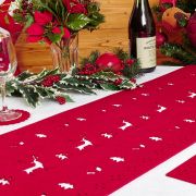 Алая фетровая дорожка на стол – прекрасный новогодний дизайн с елочками и оленями, который будет достойно смотреться на белоснежной скатерти. Ширина дорожки - 30см, длина – 150см. Производитель:Великобритания.