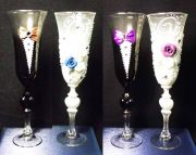 Набор состоит из двух фужеров - один для жениха, другой для невесты. Оба бокала украшены вручную и запакованы в красивую подарочную упаковку. Фужеры разных цветов и с различным оформлением представлены в ассортименте.