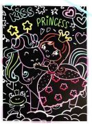 Наверняка, ваш ребенок уже умеет рисовать красками, карандашами и фломастерами. А как насчет гравюры? Этот вид творчества необычен тем, что вы не добавляете штрихи, а убираете лишнее, чтобы получить красивую картину. Изначально изображение скрывается под темным напылением, которое нужно счищать, следуя рисунку. Результат вас удивит! Создайте разноцветную картину с изображением принцессы, повесьте у себя в комнате или подарите кому- нибудь.