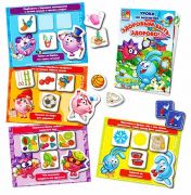 В наборе вы найдет 4 магнита с героями мультфильма, 28 тематических магнита, 4 карточки с заданиями и книжку-пособие в помощь родителям.