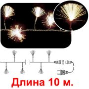 Светодиодная электрогирлянда с фиброволокном. Постоянное свечение. С каждой стороны гирлянды имеется разъем-коннектор («мама-папа»). С одной стороны подсоединен шнур питания (входит в комплект), с противоположной установлен колпачек-заглушка. Используя эти разъемы можно соединить гирлянды между собой последовательно в цепочку до 8-и гирлянд с одним шнуром питания.