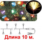 Светодиодная электрогирлянда с фиброволокном. Мерцающая и переливающаяся разными цветами. С каждой стороны гирлянды имеется разъем-коннектор («мама-папа»). С одной стороны подсоединен шнур питания (входит в комплект), с противоположной установлен колпачек-заглушка. Используя эти разъемы можно соединить гирлянды между собой последовательно в цепочку до 8-и гирлянд с одним шнуром питания.