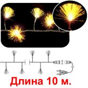 Светодиодная электрогирлянда с фиброволокном. Постоянное свечение. С каждой стороны гирлянды имеется разъем-коннектор («мама-папа»). С одной стороны подсоединен шнур питания (входит в комплект), с противоположной установлен колпачек-заглушка. Используя эти разъемы можно соединить гирлянды между собой последовательно в цепочку до 8-и гирлянд с одним шнуром питания.