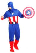 Яркий синий костюм с красно-белыми вставками смотрится очень выигрышно! Также в комплекте идет шапка с прорезями для глаз.
