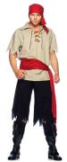 В комплекте идут: просторная рубашка со шнуровкой на груди, шорты с асимметричным низом, яркий красный пояс и повязка на голову в тон - акцент всего образа.