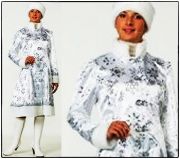 На ткань нанесен узор из снежинок, а рукава, ворот и подол оторочены белым мехом. Декоративные застежки спереди придают наряду особый шарм. В декорировании использована серебряная тесьма. Красивый костюм Снегурочки притален, имеет пиджачный крой, за счет этого хорошо садится по фигуре, позволяет скрыть недостатки и подчеркнуть достоинства. Данная модель неотрезная по линии талии, поэтому будет выгодно смотреться на девушке любого роста. Помимо шубки, в комплект входит шапочка. Головной убор выполнен в аналогичной цветовой гамме и оторочен белым мехом.