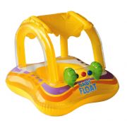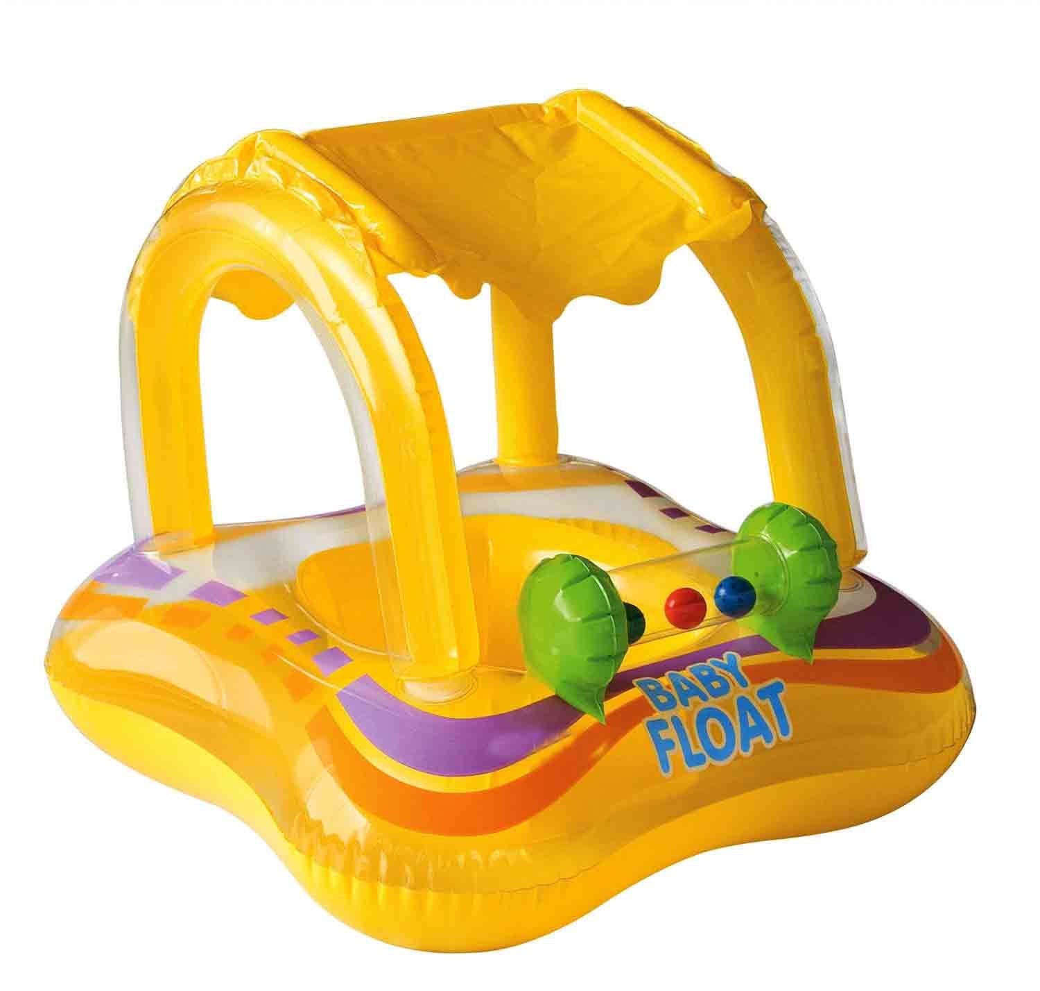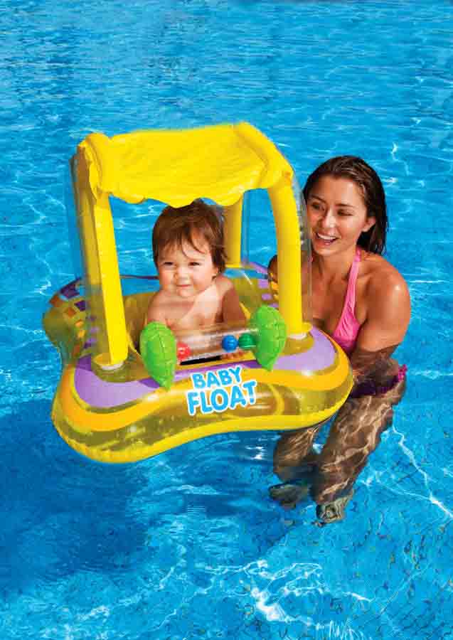 Снабжен специальным навесом, который защитит от попадания прямых солнечных лучей. Основание круга выполнено в форме трусиков, куда малыш может продеть ножки, чтобы чувствовать себя комфортно и безопасно, находясь в воде.