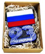 Ароматное мыло ручной работы в виде фигурного мыла "23" и триколора. Набор мыла уложен в коробку с прозрачной крышкой, на дне для мягкости бумажный наполнитель.