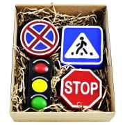 Ароматное мыло ручной работы в виде дорожных знаков "Остановка запрещена", "Пешеходный переход", "Движение без остановки запрещено" и стилизованного светофора. Набор мыла уложен в коробку с прозрачной крышкой, на дне для мягкости бумажный наполнитель.
