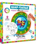 В комплекте: заготовка из папье-маше, 2 вставки-раскраски, краски 6 цветов, кисть, часовой механизм