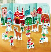 Целая картонная эльфийская деревня с домиками со снеговиками и оленями, веселыми эльфами и указателем. Основная декорация-сцена размером 35 см выполнена из плотного картона, как и все остальные небольшие декорации. Размер фигурок от 7 до 15 см, всего 10 фигурок и ножки-подставки к ним. Отличное украшение новогоднего стола, а также отличная игра для детей.