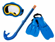 Маска выполнена из эластичного материала, который не вызывает аллергии. Благодаря этому материалу маска плотно прилегает к коже и не пропускает воду. Линзы выполнены из поликарбоната, сосоят из двух частей и обладают широким углом обзора. Ремешки маски мягкие и упругие. Трубка для дыхания под водой с эластичным и удобным загубником. Оборудована встроенным силиконовым защитным клапаном. Размер ласт можно изменять за счет изменения длины ремешка, который фиксирует ногу. Поливинилхлорид, материал, из которого изготовлены ласты, обеспечивает плотное прилегание ремешка к пятке, а также мощный толчок ласты в процессе плавания.