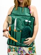 Компактная сумка-фартук с карманами вмещает в себя всё необходимое: ножи, вилки, лопатки, щипцы, перечницу, солонку и красивую удобную варежку - прихватку. После использования все предметы можно снова разложить по кармашкам, и превратить фартук обратно в сумку.