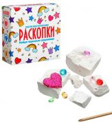 Перед вами набор для юных кладоискателей. Что внутри? Чудесные сокровища! Снимайте слои породы с помощью специального инструмента. Для того чтобы стало легче раскапывать сокровища, рекомендуем смочить брусок водой. Промойте находки и высушите. Сокровища теперь ваши!
