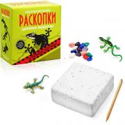 В наборе: деревянный стек для дробления, окаменелый грунт с сокровищами (россыпь разноцветных камней и фигурки ящериц из пластика). Цвета находок в ассортименте.