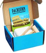 В наборе: брусок с артефактами внутри (россыпь природных камней, сувенирная монета из металла в коллекционном чехле из пластика), деревянный стек, деревянный молоточек, тематический буклет с викториной.