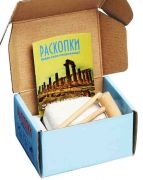 В наборе: брусок с артефактами внутри (россыпь природных камней, сувенирная монета из металла в коллекционном чехле из пластика), деревянный стек, деревянный молоточек, тематический буклет с викториной.