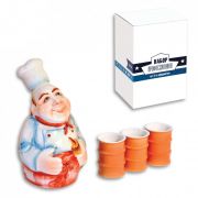 В состав входит фарфоровый подарочный штоф в виде повара и три стопки.