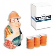 В набор входит фарфоровый штоф "Строитель" и три стеклянные стопки.