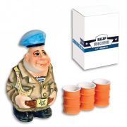 В состав подарочного набора входит фарфоровый штоф в виде десантника и три стопки.