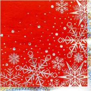 Двухслойная салфетка с искрящимися голографическими снежинками на красном фоне. В упаковке 6шт, размер 25см.