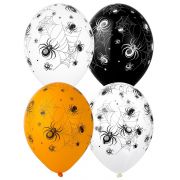 Высококачественный шар из натурального латекса. Черные, оранжевые, белые и прозрачные шары, с пятисторонним - круговая печать, шелкографическим рисунком Паутина и Пауки.