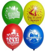 Высококачественный шар из натурального латекса. Ассорти из 10-12 цветов (в случайном соотношении), одного типа - пастель - матовый оттенок цвета. Шары с двусторонним шелкографическим рисунком (6 дизайнов на темы "Выпускник", "Последний звонок", "Поздравляем" в пакете) с большим полем печати.