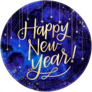 В упаковке 8 ламинированных бумажных тарелок с блестящими звездами и надписью Happy New Year.