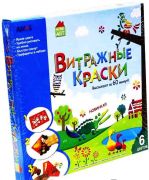 Состав: витражные краски 6 цветов по 22 мл (высыхают за 60 мин.), трафареты, картонные скребки для узоров.