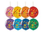 Шар-игрушка, имеющий на верхушке прикрепленную резинку, позволяющую играть им как раскидайчиком. Ассорти из 7-8 цветов. Шары с круговым оффсетным рисунком в виде больших крупных разноцветных горошин.