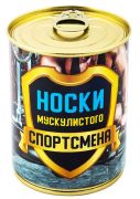 Пара мужских хлопчатобумажных носков, казалось бы, тривиальный сувенир. Но это тот случай, когда подача всё решает, поскольку упаковка у них - настоящая жестяная консервная банка с кольцом-ключом, украшенная соответствующей адресной надписью. Охотник, рыбак, начальник, водитель, лучший друг или просто суровый мужик, каждый из них улыбнётся такому забавному подарку.