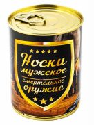 Пара мужских хлопчатобумажных носков, казалось бы, тривиальный сувенир. Но это тот случай, когда подача всё решает, поскольку упаковка у них - настоящая жестяная консервная банка с кольцом-ключом, украшенная соответствующей адресной надписью. Охотник, рыбак, начальник, водитель, лучший друг или просто суровый мужик, каждый из них улыбнётся такому забавному подарку.