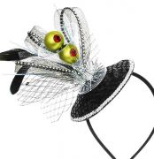 Экстравагантная шляпка на ободке – бокал мартини и оливки. Шляпка украшена вуалью, матовыми пайетками, перьями.