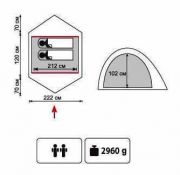 Материал: тент - 100% полиэстер 75D/190T WR PU 3000мм в ст, внутр. палатка - 100% дышащий полиэстер, дно - 100% Полиэстер 75D/190T WR PU 5000 мм в ст, каркас - фибергласс 8,5мм