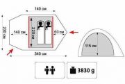 Материал: тент - 100% полиэстер 75D/190T RipStop 5000мм в ст, внутр. палатка - 100% дышащий полиэстер, дно - 100% полиэстр 75D/190T 7000мм в ст, каркас - 8,5мм дюрапул