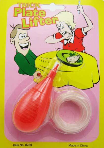 Подкладываете под тарелку, нажимаете на грушу и тарелка приподнимается