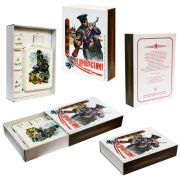 Подарочный футляр, стилизованный под спичечный коробок. Наполнение: фарфоровая фляга с тематическим изображением, 3 стопки.