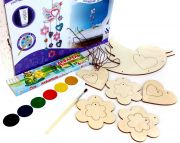 В наборе: деревянные заготовки для раскрашивания, краски и кисть, шнур для сборки подвески
