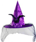 Фиолетовый остроконечный колпак с широкими полями, декорированный черным пером и вуалью - идеальный аксессуар для вечеринки Хэллоуин.