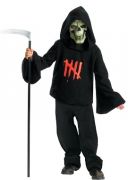 Костюм Смерть — карнавальный наряд для детей, состоящий из широких черных брюк, кофты с кровавым принтом и устрашающей маски-черепа. Набор рассчитан на ребенка ростом 134 см.