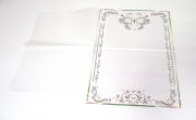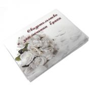 Обложка плотный картон, ламинирован плёнкой с типографской фотопечатью + тиснение золотистой фольгой (буквы). Внутри вклеен прозрачный файл для свидетельства. Размер А5