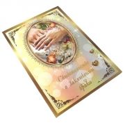 Обложка плотный картон, ламинирован плёнкой с типографской фотопечатью + тиснение золотистой фольгой (буквы). Внутри вклеен прозрачный файл для свидетельства. Размер А4