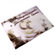 Обложка плотный картон, ламинирован плёнкой с типографской фотопечатью + тиснение золотистой фольгой (буквы). Внутри вклеен прозрачный файл для свидетельства. Размер А5