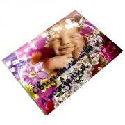 Обложка плотный картон, ламинирован плёнкой с типографской фотопечатью + тиснение золотистой фольгой (буквы). Внутри вклеен прозрачный файл для свидетельства. Размер А5
